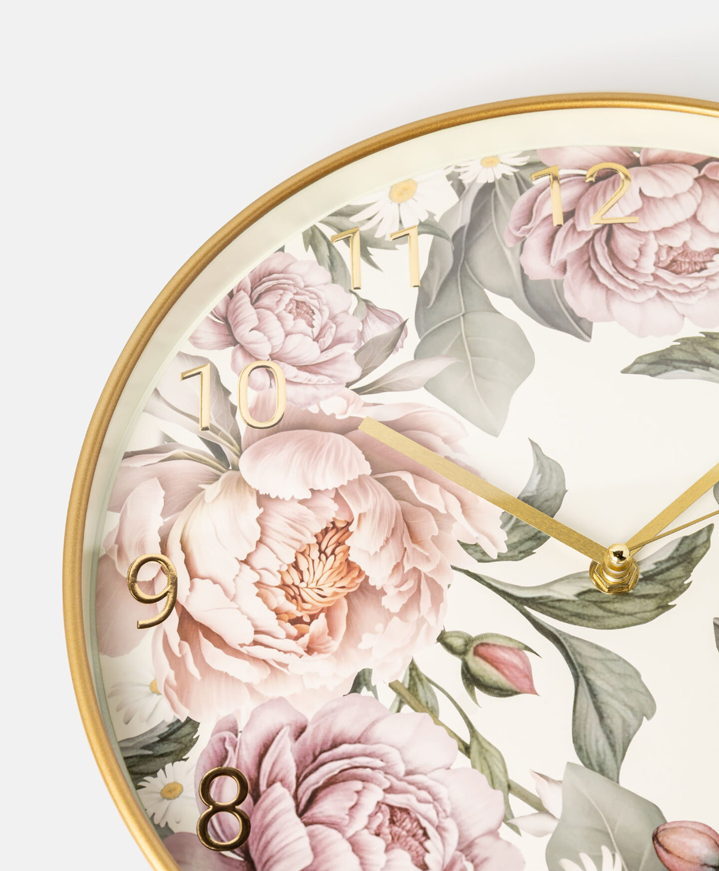 Sieninis laikrodis su gėlių raštu rodo laiką ir kartu puošia jūsų interjerą. Žydinčių bijūnų motyvas skelbia pavasarį ir suteikia spalvų bet kokiai kompozicijai. Aukso spalvos rėmelis ir rodyklės atrodo neįtikėtinai stilingai. Toks laikrodis yra puiki dovanos idėja unikalių aksesuarų mėgėjams.