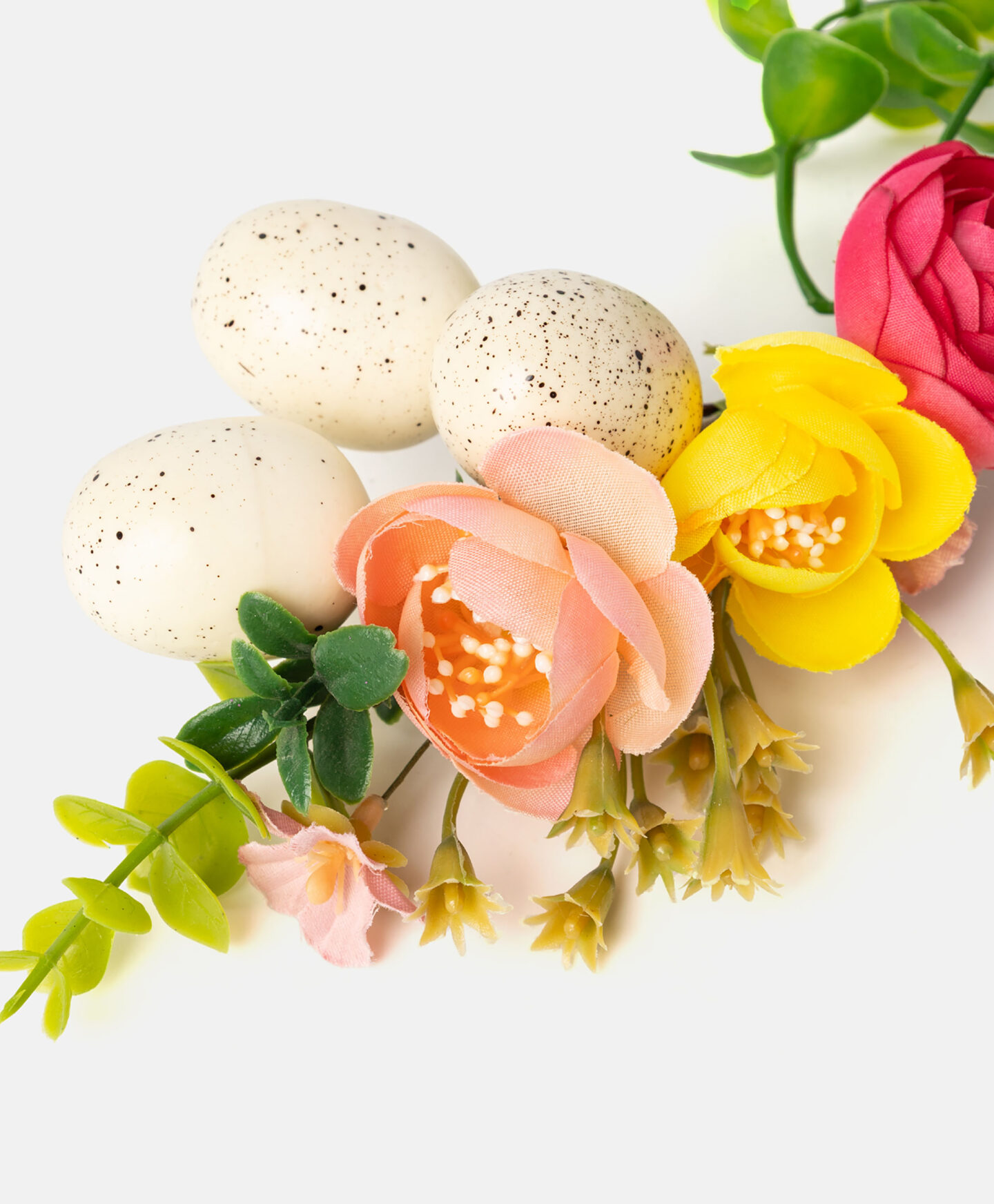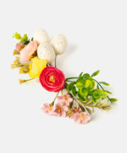 Spalvotas krepšelio vainikas – tai paruošta kompozicija, kurią galite uždėti ant velykinio krepšelio rankenos. Jis lengvas, patvarus ir atsparus oro sąlygoms. Tai puiki alternatyva šviežioms gėlėms, kurių šiuo metų laiku gali nebūti. Galimi trys skirtingi dizainai.