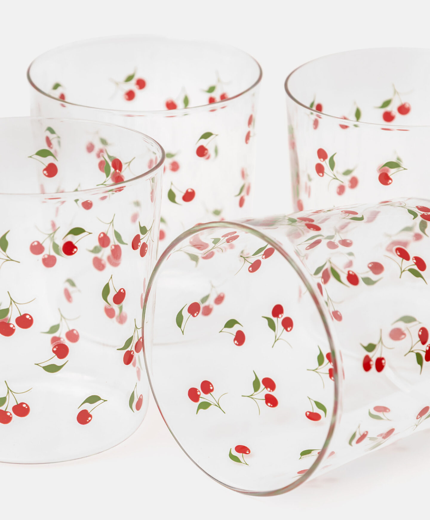 Šios 4 stiklinės su vyšnių raštu atneš vasarą į jūsų virtuvę! Borosilikatinis stiklas yra patvarus, atsparus aukštai ir žemai temperatūrai, jį lengva valyti. Šios stiklinės puikiai tinka mėgstamiausiems gėrimams patiekti. Vaisių raštas suteiks spalvų jūsų bendroms akimirkoms!