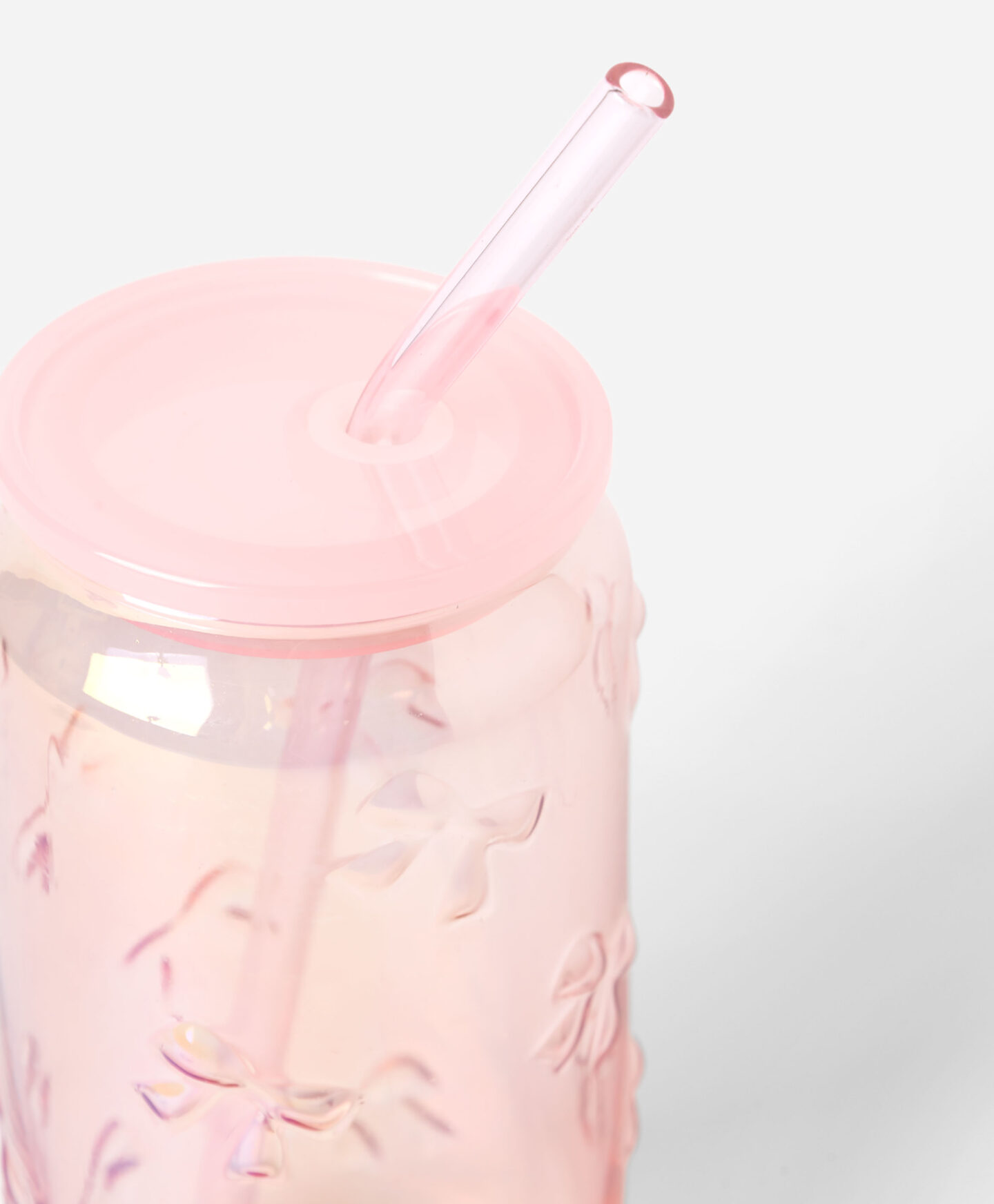 Stiklinė su šiaudeliu ir kaspinėlių motyvais