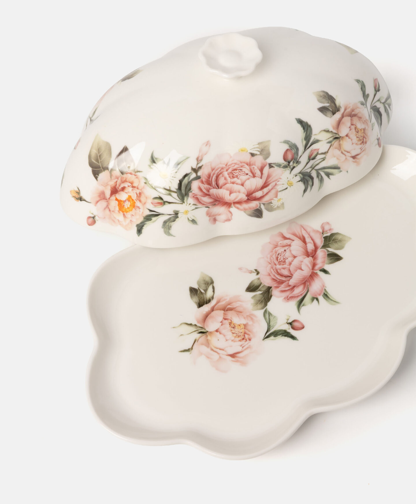 Sviestinė puikiai papildo indus iš naujausios kolekcijos su gėlių raštu. Pagaminta iš dirbtinio kaulinio porceliano, ji išlaiko tradiciniam porcelianui būdingą kreminės baltos spalvos efektą ir subtilų blizgesį. Žydinčių bijūnų raštas atneša pavasarį ant stalo! Puikiai tinka kasdieniam naudojimui ir ypatingoms progoms.