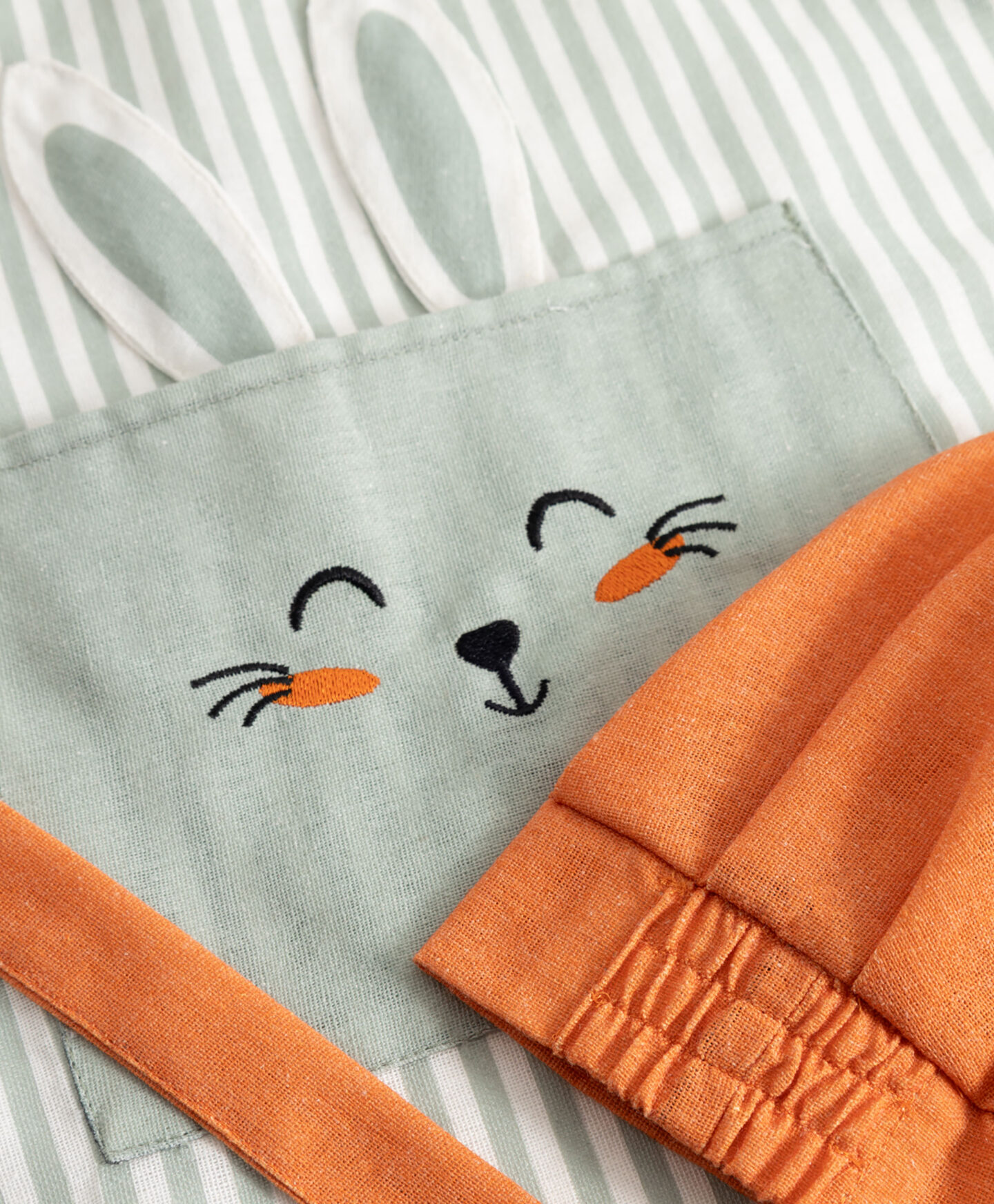 Vaikiška prijuostė su kiškučio motyvais, garantuoja daug šypsenų gaminant mėgstamus patiekalus kartu. Pavasariškas kiškučių raštas skatina vaikus įsitraukti į veiklą virtuvėje, o užsegimas lipduku ir juosmens raištis užtikrina puikų prijuostės prigludimą. Prijuostė yra patogi, lengva ir atspari skalbimui. Pridedama kepurė papildo mažojo virėjo aprangą
