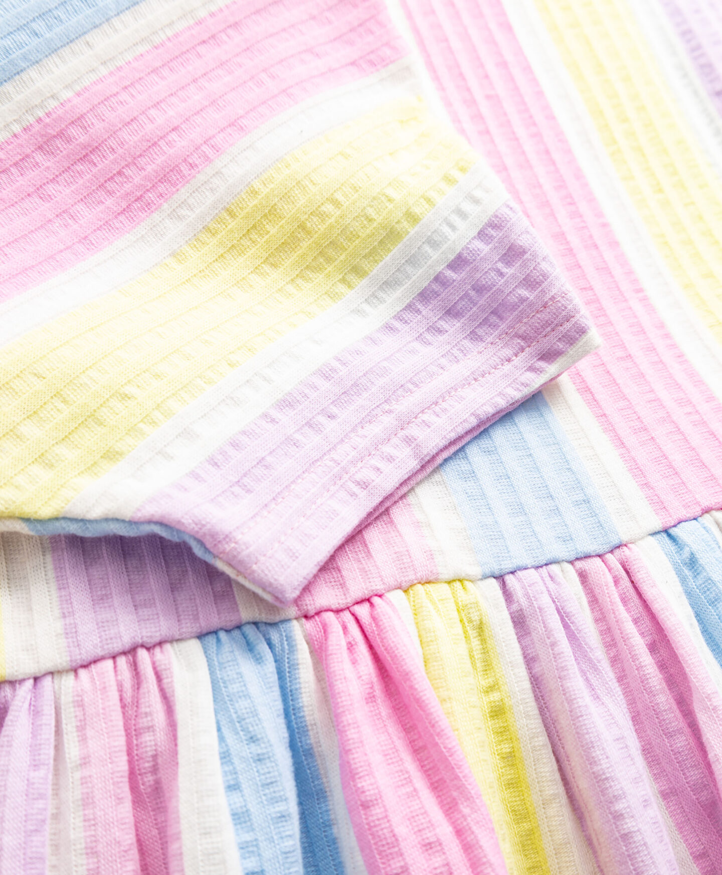 Ši vaikiška suknelė, pasiūta iš 100 % medvilnės, derina savyje klasikinį stilių ir patogumą. Pasteliniai dryžiai – karščiausias šio sezono hitas. Suknelė sukurta taip, kad būtų galima nevaržomai judėti. Šiek tiek platėjantis sijonas suteikia lengvumo ir žavesio.