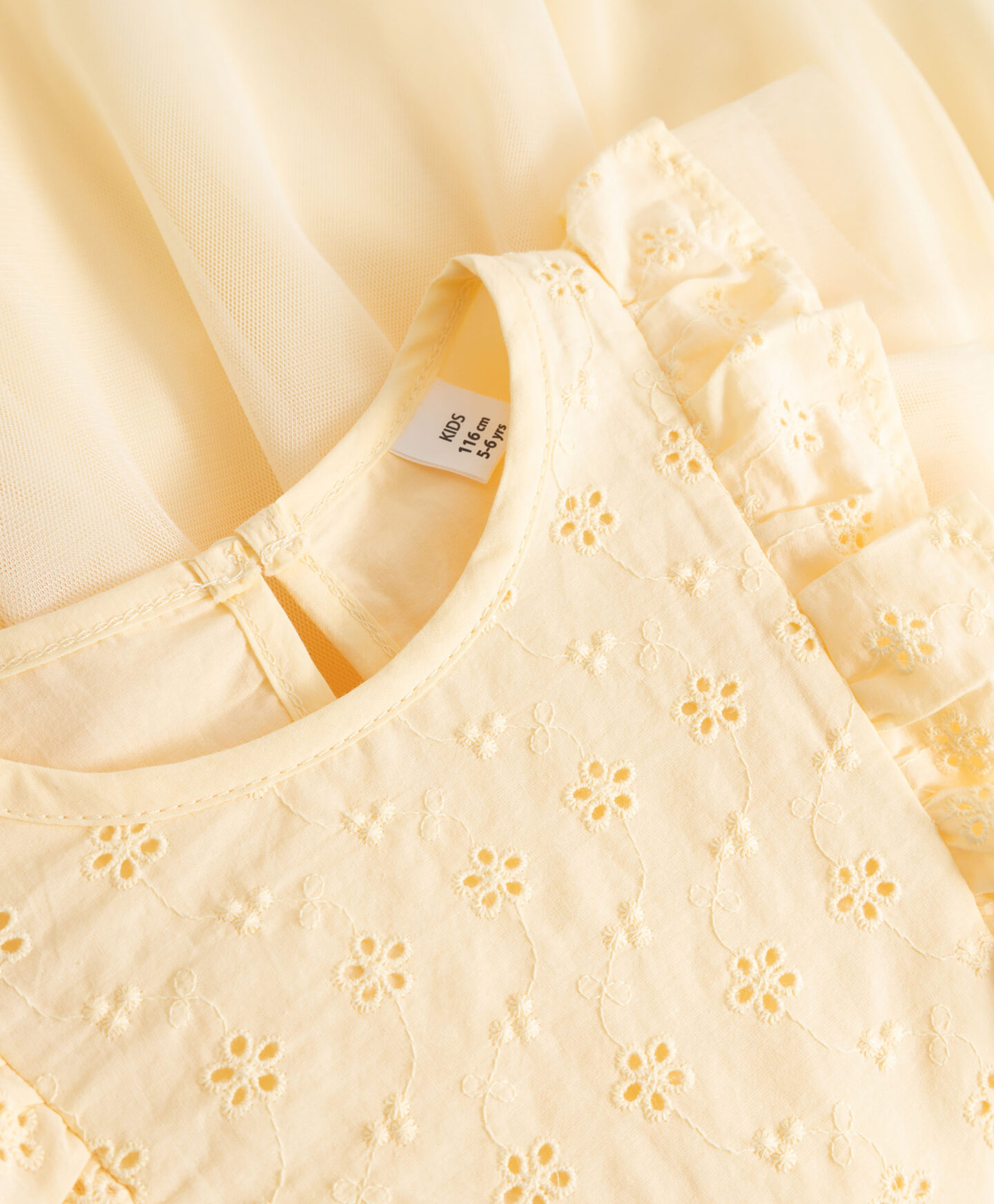 Ši pastelinės geltonos spalvos vaikiška suknelė – tikras saulės spindulėlis. Graži liemenė, perforuota subtiliais gėlių motyvais, suteikia stilingos elegancijos. Tiulio drugelių formos rankovės suteikia suknelei lengvumo ir plazdėjimo pojūtį. Tiulio sijonas – tikras grakštumo ir subtilumo įsikūnijimas. Tai puikus pasirinkimas saulėtai, šiltai dienai.