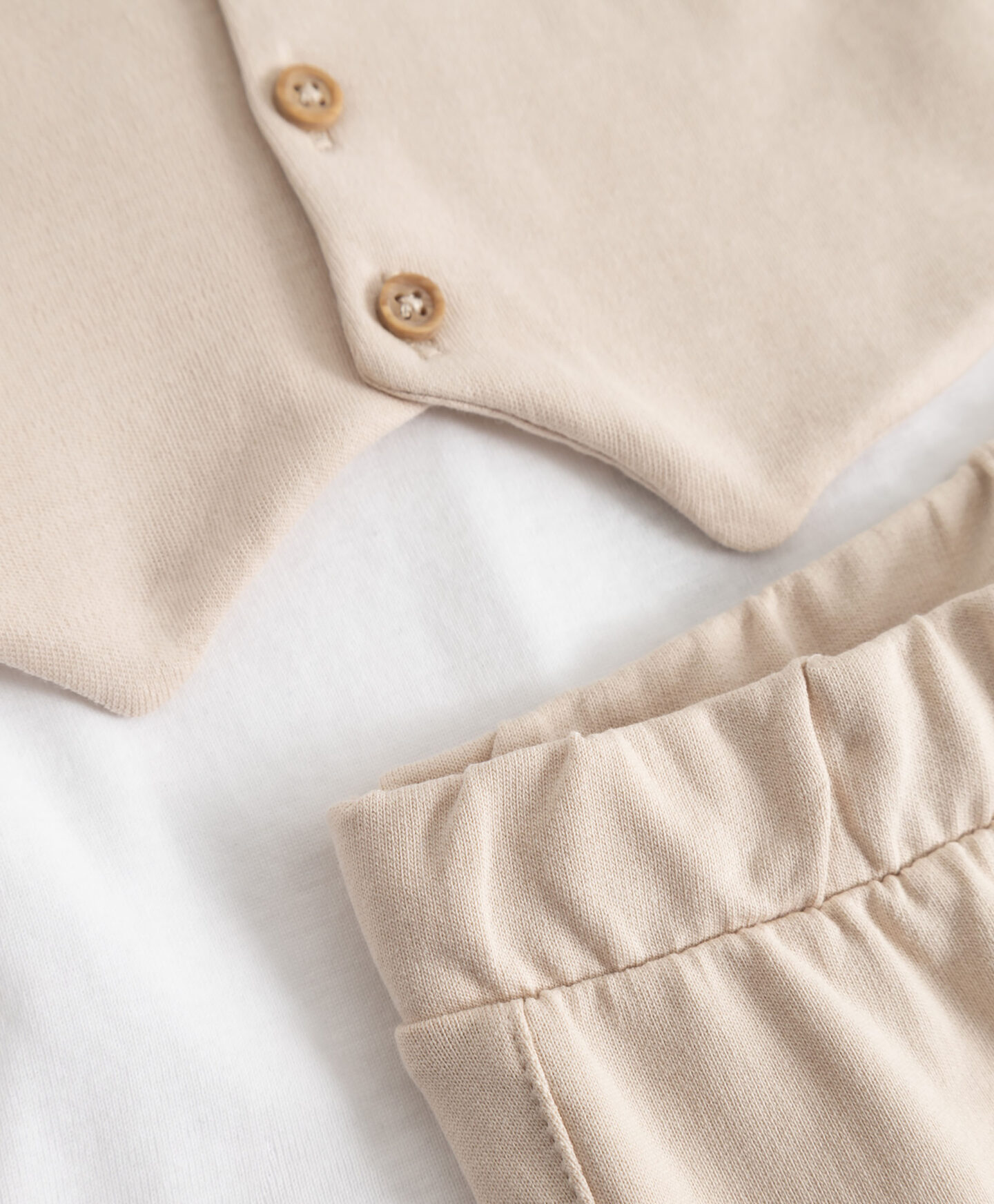 Šį vaikišką kostiumėlį sudaro smėlinukas su liemene ir kelnės. Tai paruoštas aprangos derinys ypatingoms progoms. Minkšta medžiaga švelniai priglunda prie odos, užtikrindama komfortą ir judėjimo laisvę. Spaudės tarpkojyje leidžia lengvai aprengti smėlinuką ir palengvina sauskelnių keitimą. Kelnės su elastiniu juosmeniu puikiai priglunda prie mažo pilvuko.