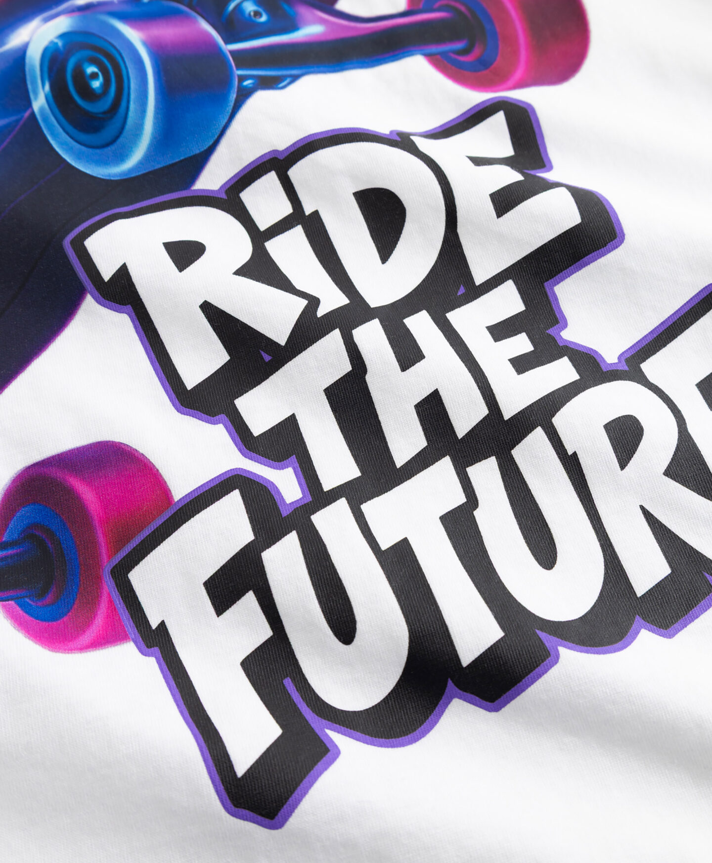 Vaikiški marškinėliai su riedlentės motyvais, 100 % medvilnės, su trumpomis rankovėmis ir dinamiška spauda priekyje. Jie puikiai tinka kartu su džemperiu arba dėvėti atskirai šiltesnėmis dienomis. Orui laidi medžiaga maloni jautriai vaiko odai ir suteikia visišką dėvėjimo komfortą. Jie puikiai tinka ir prie džinsų, ir prie sportinių kelnių.