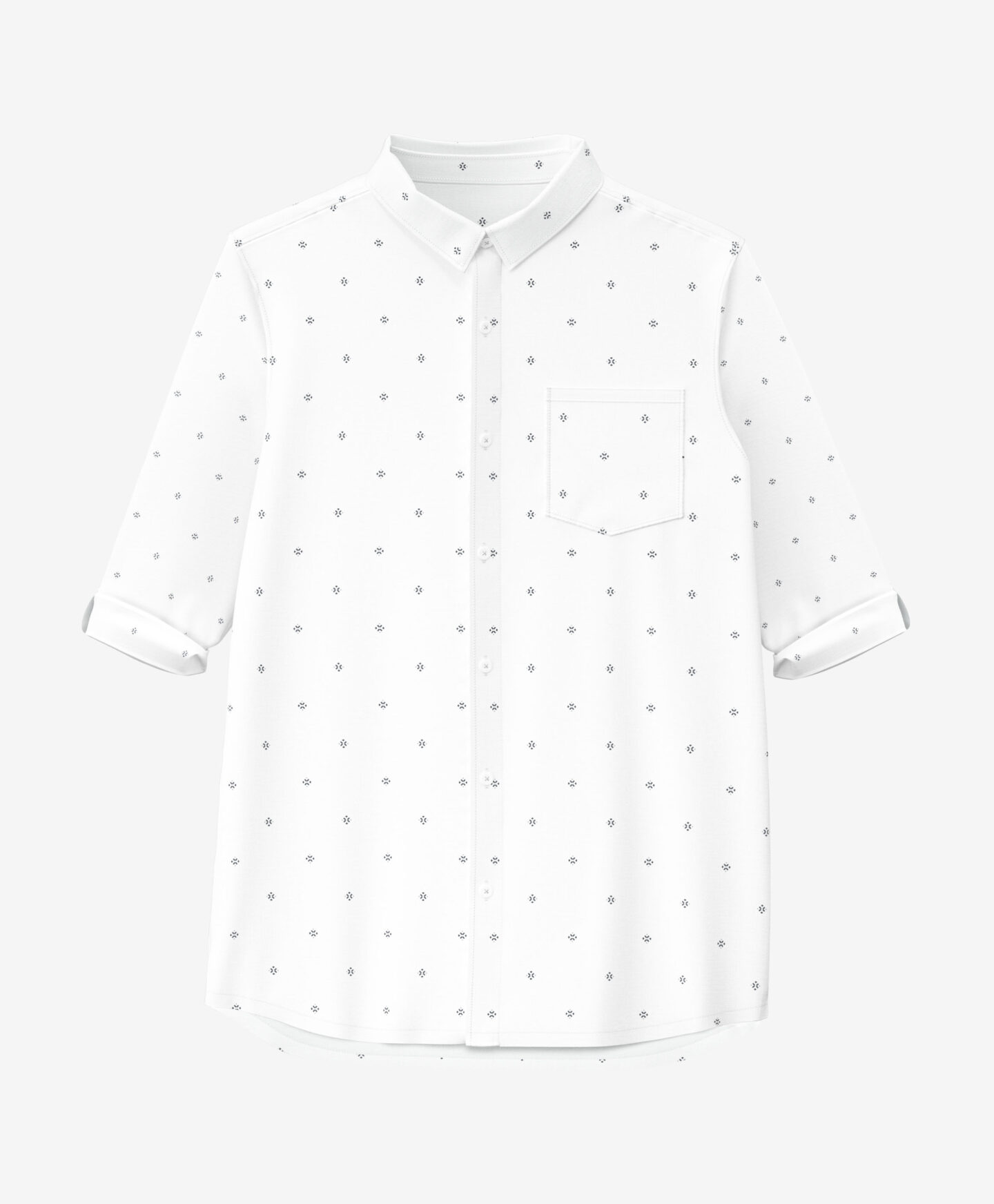 Vaikiški marškiniai, pasiūti iš 100 % medvilnės, su raštu, puikiai tinka ypatingoms progoms. Subtilus geometrinis raštas ir apykaklė suteikia jiems išskirtinumo. Derinant su megztiniu ar kardiganu, tinka ir šeimos susitikimams, ir šventėms mokykloje. Orui pralaidi medžiaga užtikrins jūsų vaiko komfortą.