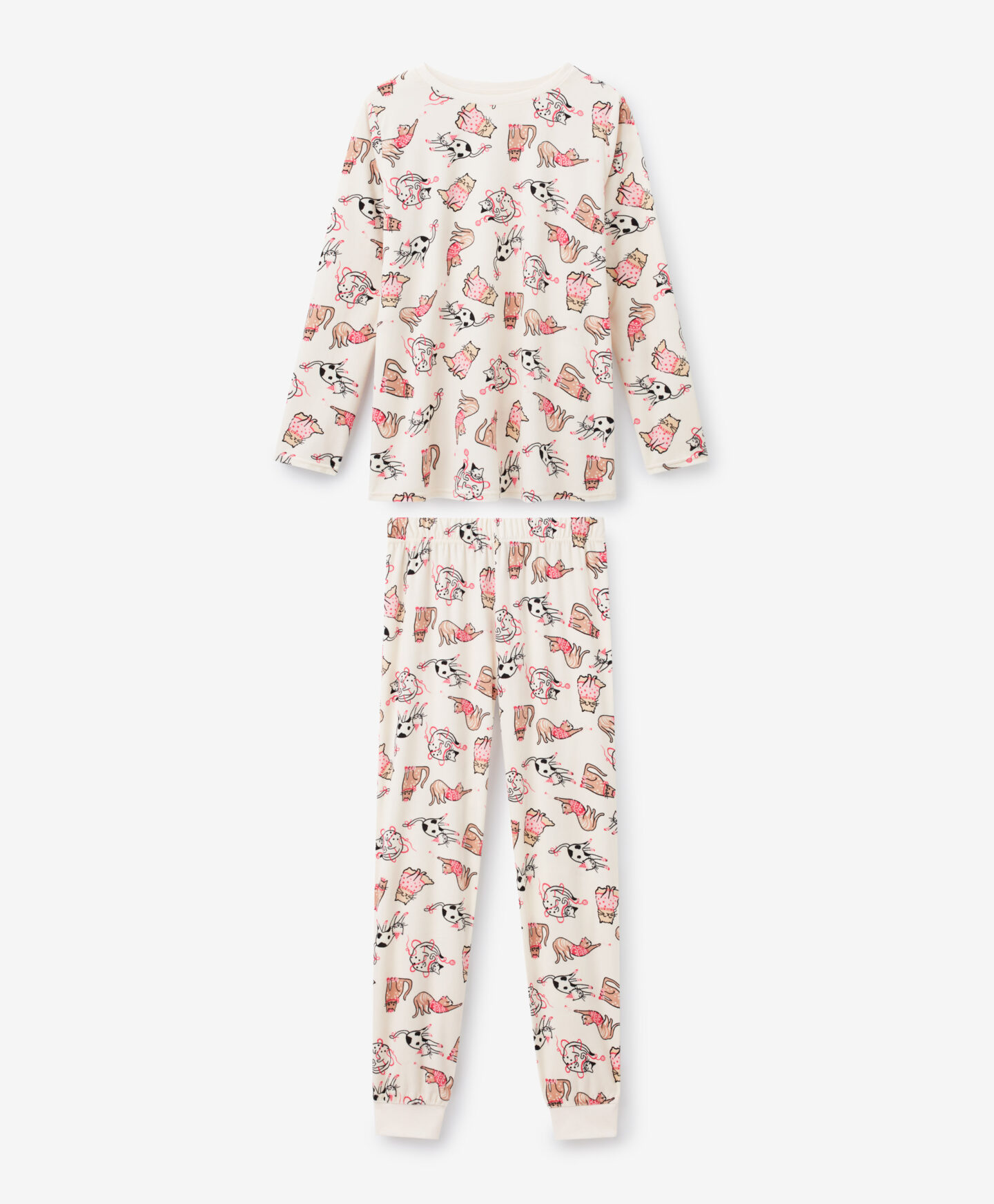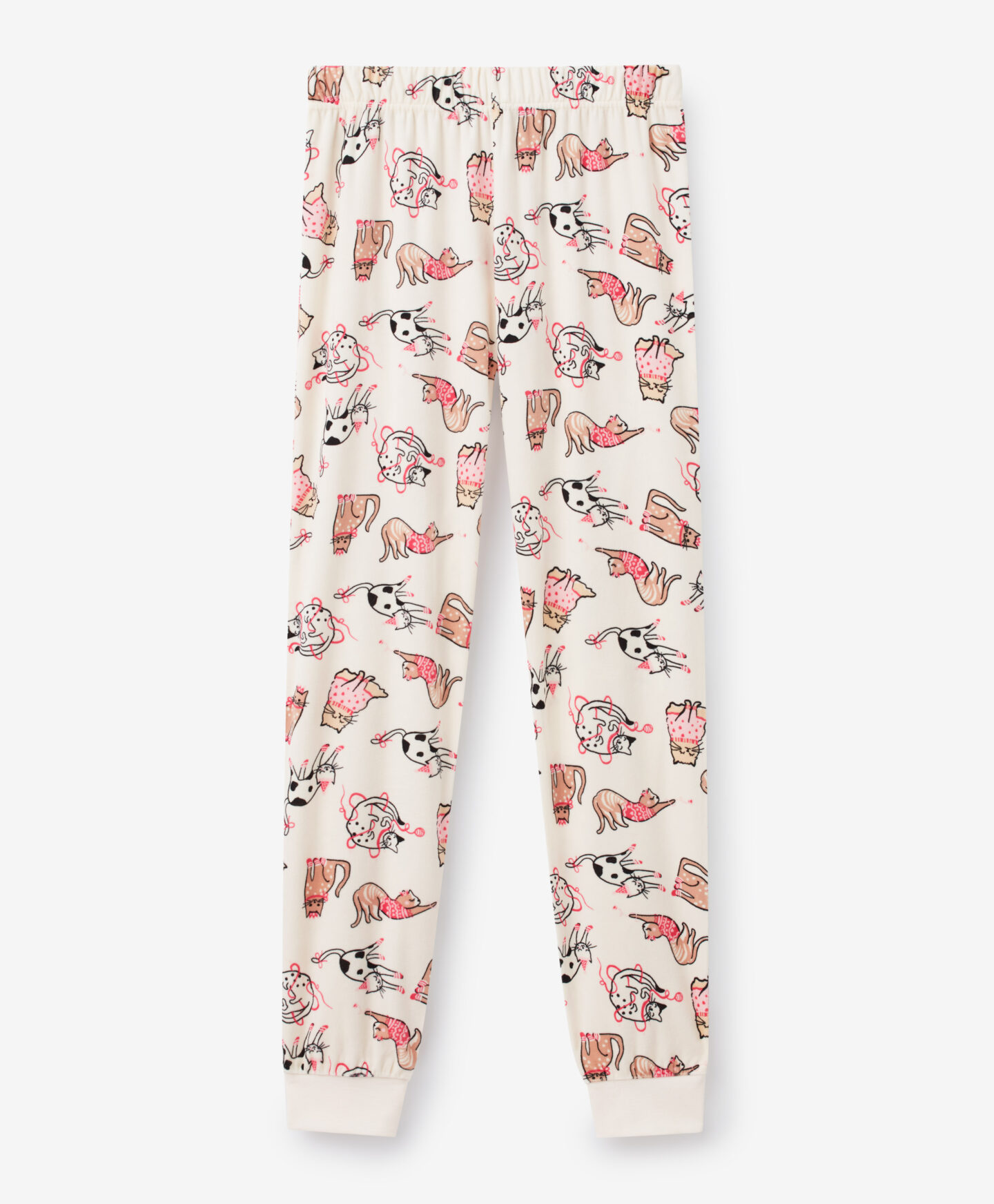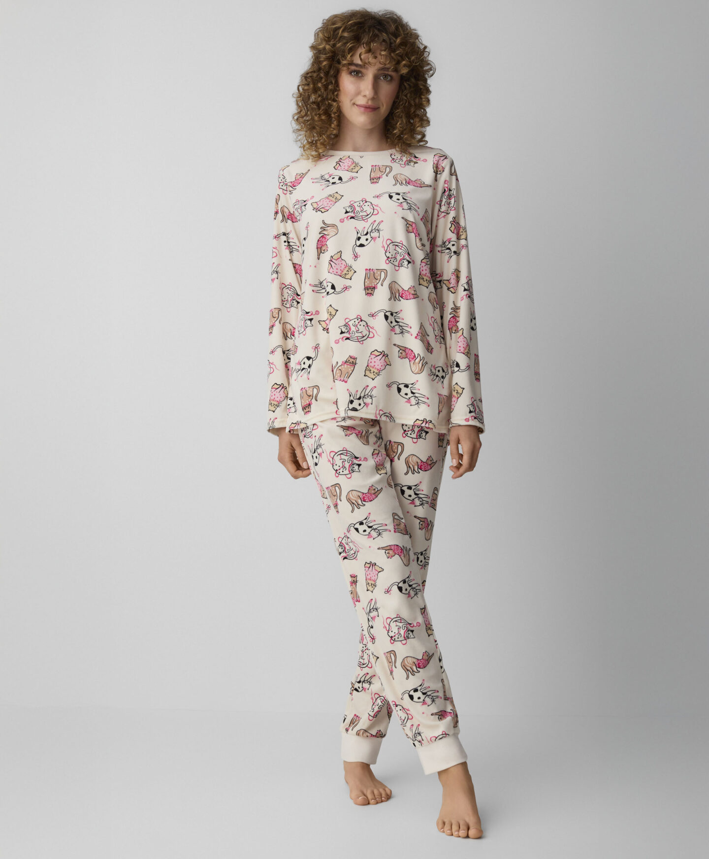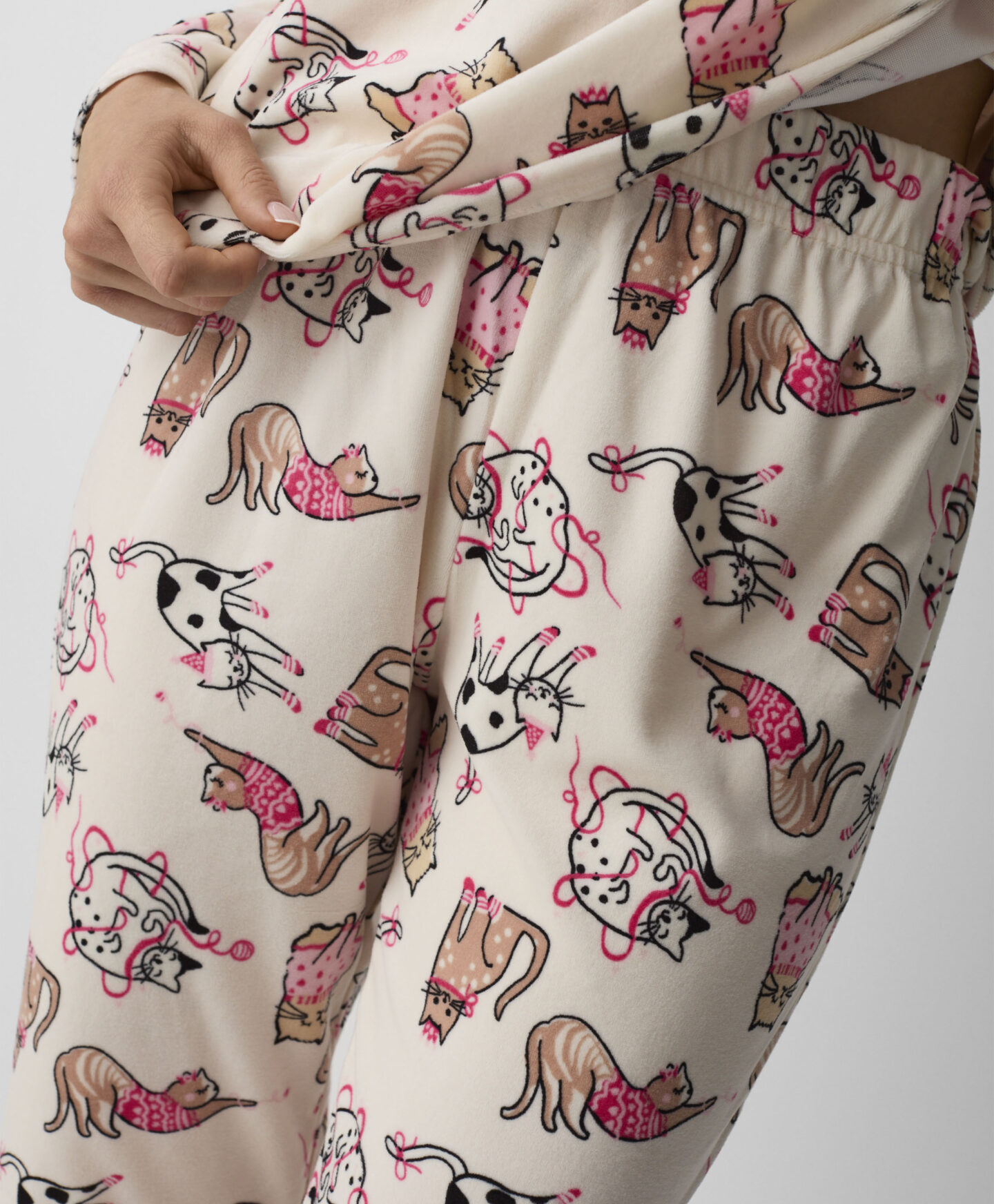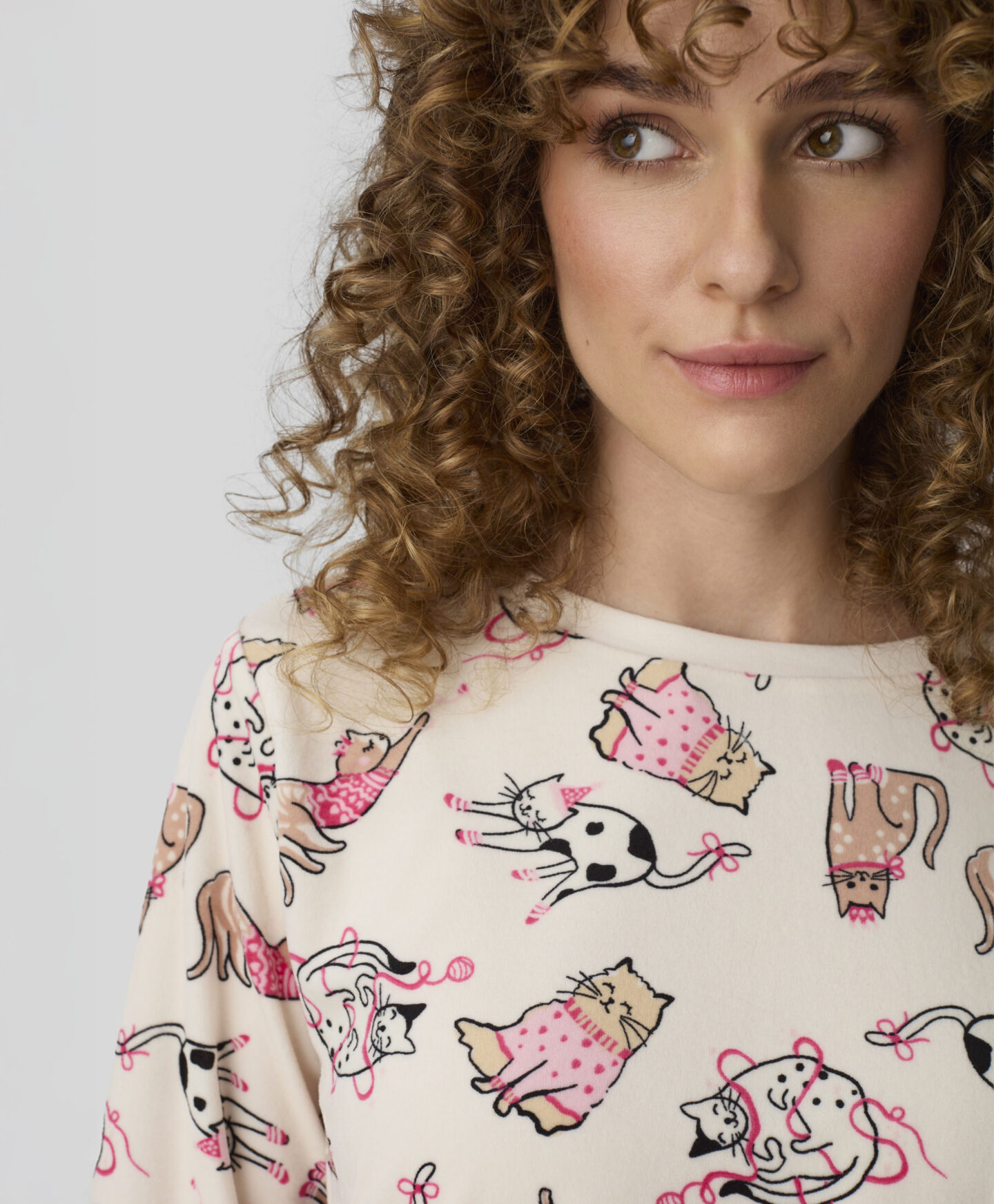 Veliūrinė pižama su kačiukais puikiai tinka vėsesnėms dienoms. Pasiūta iš minkšto ir malonaus liesti veliūro, ji suteikia šilumos, komforto, nevaržo judesių. Žaismingi raštai su kačiukų motyvais privers jus norėti dėvėti ją prieš miegą.