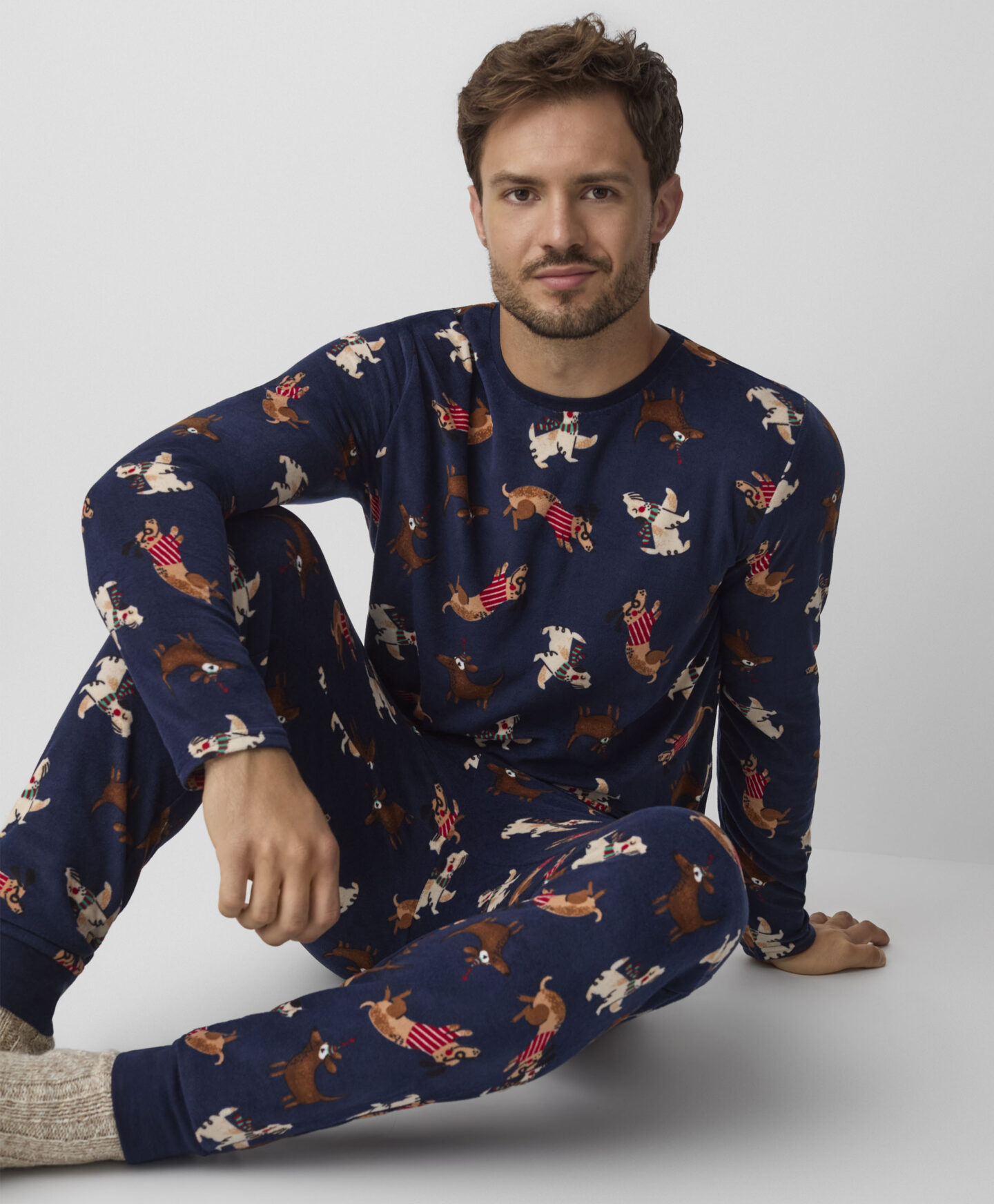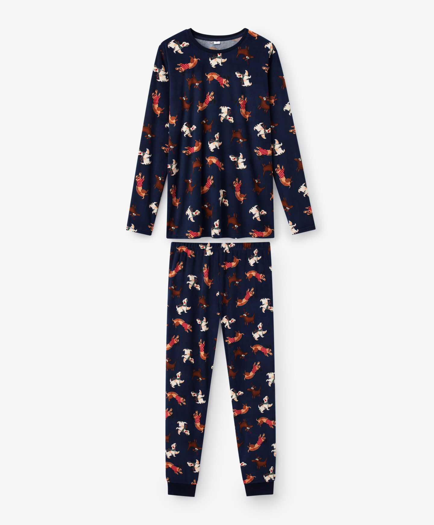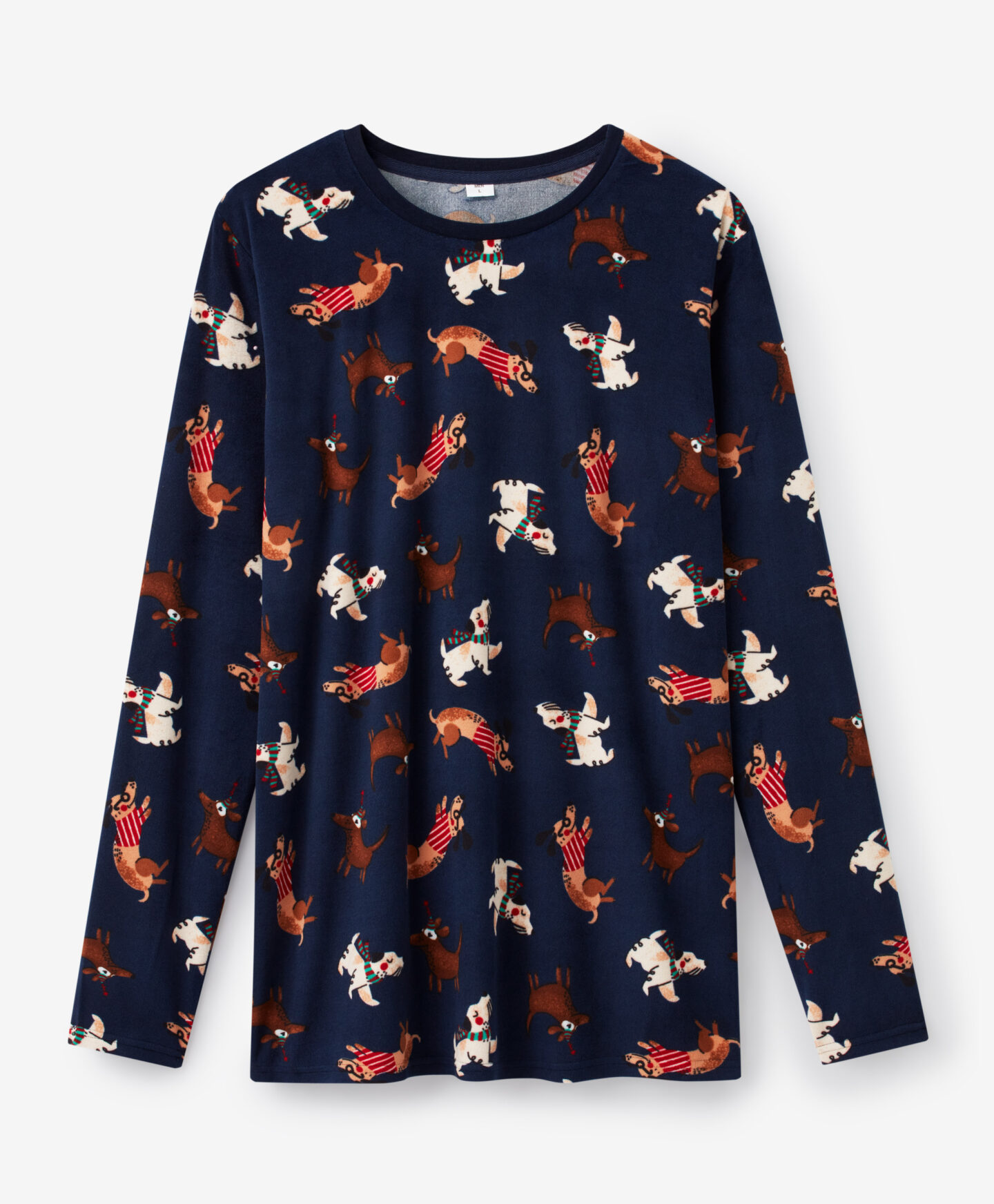 Veliūrinė pižama su šuniukais puikiai tinka vėsesnėms dienoms. Pasiūta iš minkšto ir malonaus liesti veliūro, ji suteikia šilumos, komforto, nevaržo judesių. Žaismingi raštai su šuniukų motyvais privers norėti ją dėvėti prieš miegą. Idealiai tinka šių keturkojų draugų mylėtojams.
