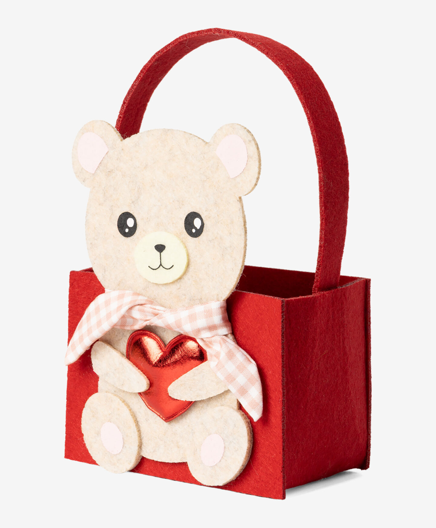 Veltinio krepšelis su meškučio motyvais – tai puikus būdas sukelti šypseną ir pabrėžti dovanos unikalumą. Tai gali tapti žavinga pakuote Valentino dovanai, pavyzdžiui, šokoladiniams saldainiams, kvapiajai žvakei, papuošalams ar kitoms romantiškoms smulkmenoms. Galima rinktis iš trijų dizaino variantų.