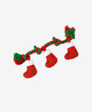 Žaislas šunims su virvele ir kojinėmis yra spalvingo dizaino ir minkštų raudonų kojinių formos. Tvirta virvė užtikrina ilgaamžiškumą, o pliušiniai elementai paįvairina žaidimą ir skatina griebti. Spalvų gama primena šventinę nuotaiką ir suteikia šuniui patrauklios veiklos, kuri suteikia judesio ir džiaugsmo.