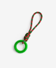 Žaislas šunims su virvele ir žiedu pagamintas iš pintos virvelės ir lankstaus žiedo. Žiedo struktūra skatina griebti ir kramtyti, o kitoje pusėje esanti kilpa puikiai tinka traukti. Dėl formų įvairovės žaidimas tampa dar įdomesnis, o traukimo žaidimas puikiai įtraukia šunį tiek namuose, tiek pasivaikščiojimų metu. Dėl to kasdienė veikla įgauna šventinį pobūdį.