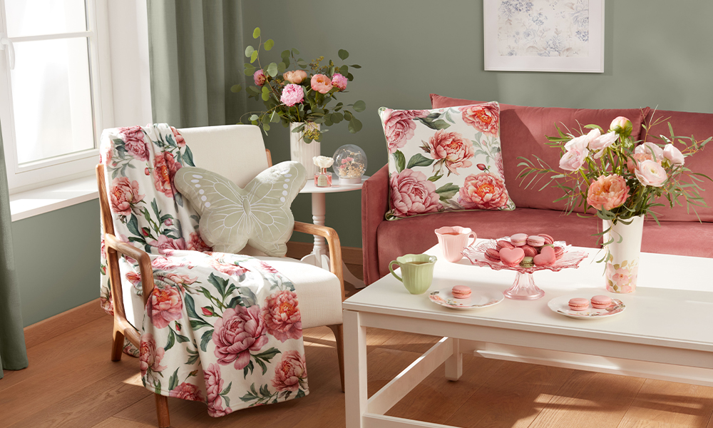 Gėlių motyvai yra puikus aksesuaras, leidžiantis greitai pakeisti patalpų išvaizdą be didelių pokyčių. Geriausia rinktis raštuotus tekstilės gaminius: lovos užklotus, pledus, pagalvės užvalkalus, patalynę, virtuvės rankšluosčius, staltieses ir servetėles. Virtuvėje ir valgomajame verta įvesti gėlių dekoracinius elementus ant elegantiškų stalo indų.